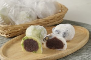 十勝産の小豆を使った大福に、中札内村産のえだ豆を加えてつくった枝豆大福と、十勝産の黒豆を使用した黒豆大福のセットです。 -