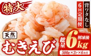 <定期便・全6回(連続)>天然 特大 むきえび (総量6kg・500g×2P×6回)