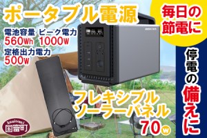 ポータブル電源(電池容量560Wh 定格出力電力500W ピーク電力1000W)+フレキシブルソーラ