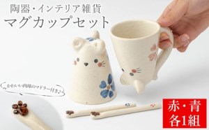 ネコのマグカップとマドラーのセット赤・青の2色(計2組)