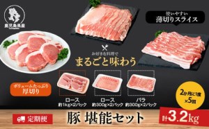 うれしい厚切りステーキ、とんかつ、しゃぶしゃぶ、鹿児島の豚肉を思いっきり楽しめるパックです!2ヶ月に1度3.2kgずつ、5回に分けて合計約16kgを発送いたします。