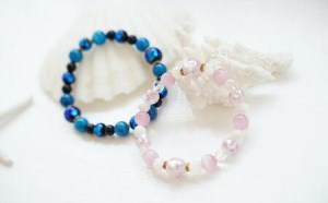 ブレスレットにはブルーのホタルガラスと天然石(ターコイズ・ブルーレース・シェルパール)を合わせました。