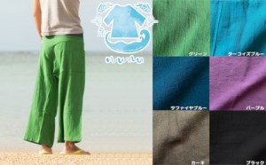 タイパンツの折り返しの部分に、沖縄伝統工芸であるミンサー織模様の生地をポイントにした、琉球タイパンツです。ファスナーやゴムのない、布だけで出来たタイパンツ、横幅の広~いズボンを体に巻き付け紐で縛るスタイルです♪