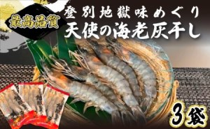 最高品質をほこる「天使の海老」を登別で採集された火山灰を使い灰干し製法で作り上げました。灰干しにした天使の海老は「上品な甘み」と「弾力のある歯ごたえ」が他の海老とは一味違います。そのまま食べるよりも灰干しにする事で海老から適度な水分と臭みを抜き、旨味を凝縮する事ができます。焼いてもよし!素揚げもよし!天ぷらもよし!お好みの調理方法でお召し上がりください。1尾約38g前後です。5尾/パック×3パックのセットとなります。