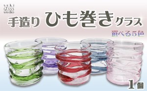 里山に吹く風の流れをイメージした『ひも巻きグラス』は、色ガラスの紐を巻きつけ、さらに手なり(指掛け用凹み)を施したグラスです。