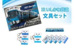 IRいしかわ鉄道の駅名キーホルダー・マグネット、521系電車が描かれた定規・クリアファイルをセットにしました。