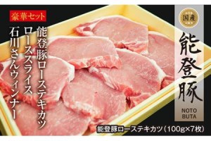 能登豚とは、県内産飼料米を使用し、石川県内で飼育、石川県金沢食肉流通センターで処理、日本食肉格付協会による格付、衛生的な管理のもとで生産といった基準をクリアした安全・安心な豚肉につけられています。この能登豚のローステキカツ、ローススライス、ウィンナーをセットに大満足なボリュームでお届けします。