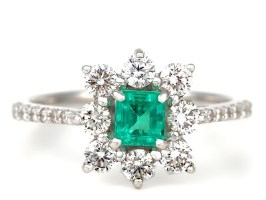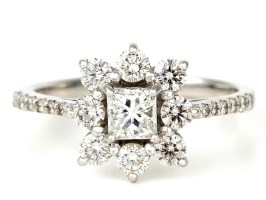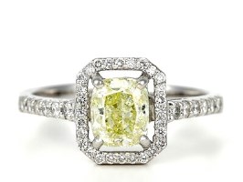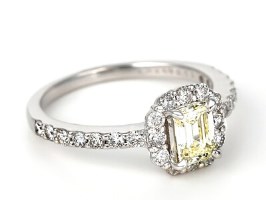ライトイエローカラーの中石を透明色のダイヤモンドで取り巻いて、より一層ライトイエローカラーが引き立つように仕立てました。