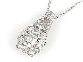 中石に据えたエメラルドカットのダイヤモンドを包み込むように10石のダイヤモンドを配置し、バチカン部分にもダイヤモンドをあしらったトータル1.222ctのとても豪華なペンダントです。