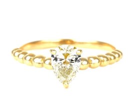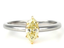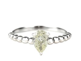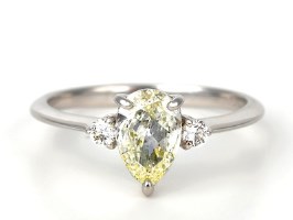 ベリーライトイエローカラー、大粒0.972ctのペアシェイプカット(つゆ型)ダイヤモンドをセンターに留め、両脇には透明色のダイヤモンド2石を留めたトータル1.072ctのリングです。