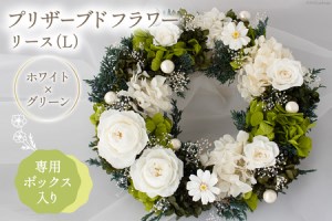 ホワイト×グリーン系ですっきりまとめた、大人の雰囲気漂う落ち着いた色調のプリザーブドフラワーリースです。