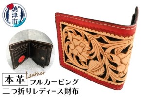 ハンドメイド・レディース二つ折り財布 アメリカン・シェリダンスタイルカービングデザインを全体にあしらった財布です。カード収納は基本3枚、出し入れしやすく見やすいコイン入れとお札やレシートも十分に収納出来ます。全ての工程を手縫いで仕上げているのでミシン縫いより遥かに丈夫で長く使っていただけると思います。