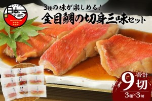 金目鯛の煮付け・金目鯛の西京漬け・金目鯛の味噌漬け3種類の味が各3切ずつ入ったセットです。