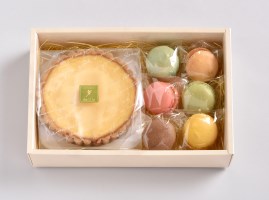 市内にある店舗内の厨房で一つ一つ丁寧に心を込めて手作りしたチーズタルトとマカロンの詰め合わせです。 -