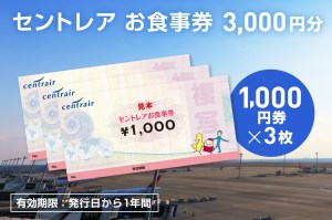 セントレア内飲食店(フードコート店舗含む)での店内飲食にご利用いただけるお食事券3千円分をお届けいたします🛫 中部地方最大の空の玄関口・中部国際空港セントレアで、名古屋めしをはじめとする多彩なグルメをお楽しみいただけます🍴 また、国内線・国際線の制限エリア内の飲食店でもご利用いただけます‼️ ご旅行など飛行機をご利用いただく際はもちろん、セントレアに遊びに来る際にも、是非ご活用ください✨✨ 🚚お届け内容🚚 セントレアお食事券 1,000円券×3枚