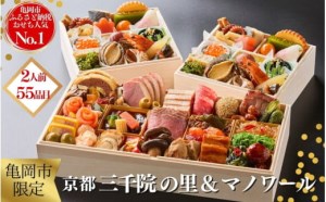 古くから「京の台所」として知られる亀岡市が自信を持ってお届けする、『亀岡市ふるさと納税限定』のおせちをご用意しました。 迎春おせち 京都三千院の里&マノワール 寄附金額:59,000円 仕様: 和風2客とオードブル1段 品目: 55品目 人数: 約2人前 冷蔵、重箱付、盛付済 京都「三千院の里」と「マノワール」の監修によるコラボレーションおせち。全国有名百貨店にておせち料理を展開するブランドから、亀岡市ふるさと納税限定のおせち料理をご用意致しました。 毎年人気のおせちです。お早めにお申し込みください。