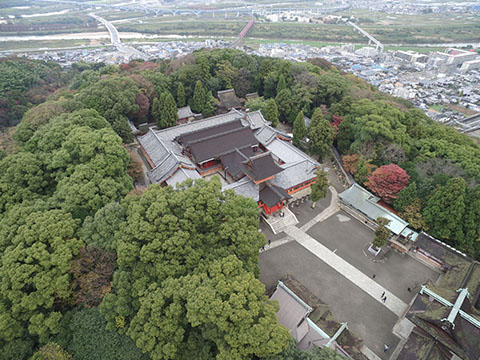 “やわたのはちまんさん”の名で親しまれている石清水八幡宮は、全国屈指の厄徐の神社として、新春の時期には参拝者が多く訪れます。参道ケーブルが整備されている他、男山山上には展望台があり、北西には天王山、北東には比叡山を含む山背盆地全体が見渡せる貴重なスポットになっており美しい景観を楽しむことができます。