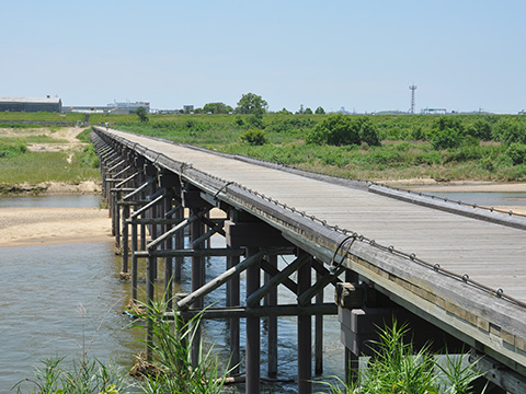 正式名称は府道八幡城陽線上津屋橋(こうづやばし)。長さ356.5m、幅3.3mの木津川にかかる日本最長級の木橋です。増水すると、床板が流れるように作られていることから“流れ橋”と呼ばれています。木津川堤防のサイクリングロードとともに近隣の人々の憩いの場となり、映画等のロケ地として利用されています。