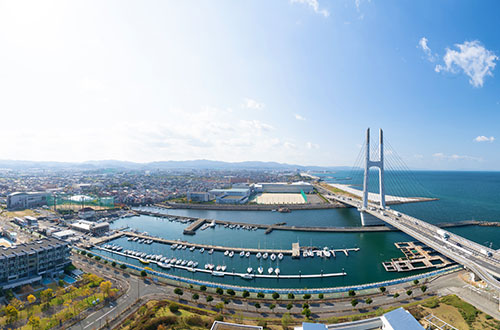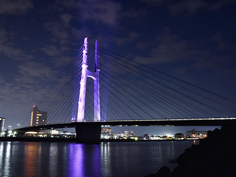 全長338.1m、幅26.3m、高さ110mと国内でも大きな斜張橋で、景観も美しい橋です。遊歩道が整備されていますので、沖合い5kmにある関西国際空港を離発着する様子が見渡せ、気持ちよくウォーキングを楽しむことができます。また、夜間はライトアップを行っています。