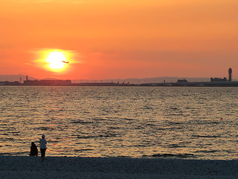 白い玉石と青い海のコントラストがまぶしい綺麗なビーチです。ビーチには白い大理石が敷き詰められ、背後には青い松林が続きます。関西国際空港を望みながらの夕景が最高のスポットです。また、関西国際空港から飛び立つ飛行機も眺められます。