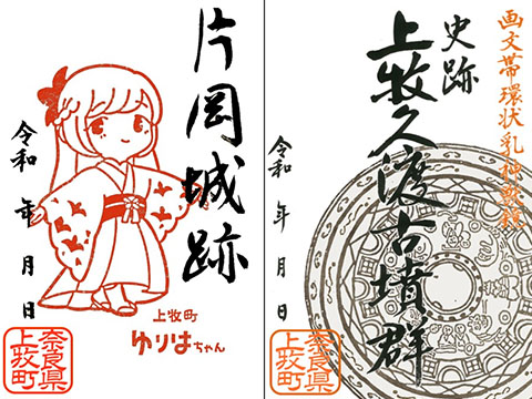 上牧町では「片岡城跡」と「史跡 上牧久渡古墳群」の2か所が選ばれており、それぞれ2種類ずつ御墳印のデザインがあります。
