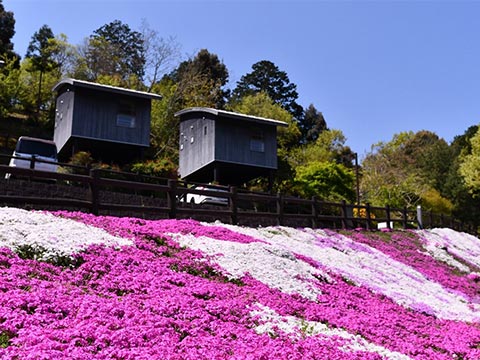 芸術家村「匠の聚」の玄関口、約2,000㎡にピンクや紫、白の芝桜が咲き詰められ、まさに「花のじゅうたん」のようです。村内のボランティアで大切に育てた芝桜の美しさは見事の一言と言えます。