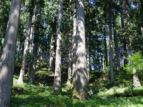 面積約3,700㎡の山肌に、樹齢260年~400年の杉や桧が林立しており、大きな杉になると、胸高直径164cm、幹回り515cm、高さ約50mにも達します。天にむかってそびえたつ杉や桧を間近で見上げると、自然の偉大さに圧倒されてしまいます。私たちに自然と林業の大切さを伝える歴史の証人です。