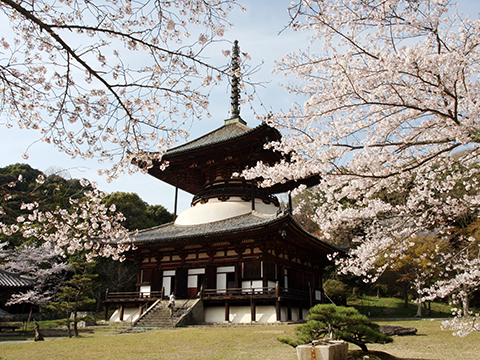 高野山の学僧でもあった覚鑁(かくばん)上人によって開創された新義真言宗の総本山。覚鑁上人の法灯が今日まで受け継がれている根來寺には、国宝の根來寺大塔をはじめとした建造物や仏像などの貴重な文化財が数多く現存。春には桜、秋には紅葉といった四季折々の豊かな自然や優れた景観にも恵まれています。