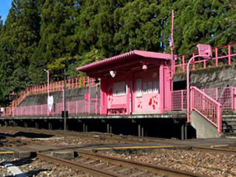 全国に「恋」が付く駅はわずか4つで、西日本にはこの「恋山形駅」が唯一の駅です。ピンクの駅舎、フェンス、ベンチ、恋ポスト、ハート型の絵馬や恋愛成就お守りが買える自動販売機の設置、恋の待合室など、ハートとピンクで一杯の空間です。恋ポストに手紙を投函すると、地元郵便局でハート型の風景印が押されます。