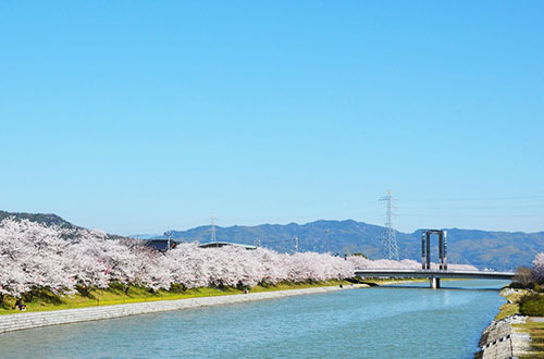 春には、町中央部を流れる田布施川で約300本の桜が咲き誇り、壮大な景色が広がります。その時期に行われるたぶせ桜まつりは毎年多くの観光客で賑わいます。