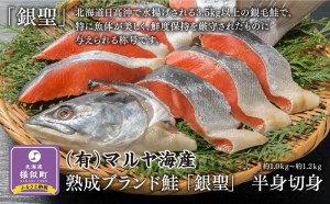 「銀聖」とは、北海道日高沖で水揚げされ3.5k以上の銀毛鮭で、特に魚体が美しく鮮度保持を厳守されたものに与えられる称号です。その「銀聖」を山漬けといわれる手法で仕上げました。「山漬け」とは、新巻鮭同様に北海道では古くから伝わる塩蔵貯蔵方法で、約2週間掛け大量の塩を使い山のように積み上げ、熟成させながら上下の入れ替えを行い塩抜き後(ここで味がきまります)、寒風干しにて仕上げるもです。是非北海道のごちそうをご家庭でお召し上がりください。
