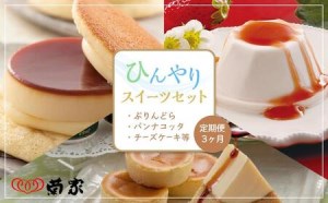 お家でお菓子の菊家のひんやりスイーツを堪能できる定期便3か月です。 下記返礼品を3か月連続でお届けします。是非この機会にお楽しみください。 【内容量】 1回目:ぷりんどら 9個入 2回目:パンナコッタ 3個入 2箱セット計6個 3回目:ぷりんバーム 1個・カラメルソース 7g×4個・半熟チーズケーキ 4個 【事業者名】 株式会社 菊家