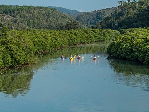 マングローブは、海水と淡水が混じる汽水域に茂るヒルギなどの植物の総称をいいます。東村ふれあいヒルギ公園から慶佐次川に広がるマングローブをカヤックで進み、ガイドの案内で生息する植物や生き物を知ることができます。