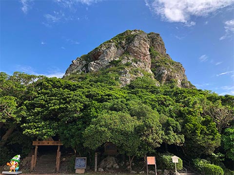 島のほぼ中央にある海抜172mの山で「タッチュー」の愛称で親しまれている伊江島のシンボルです。山頂からは島全体はもちろん、沖縄本島や東シナ海など360度絶景を見渡せます。地層にオフスクレープ現象が見られる世界的にも珍しい山で、目に見える形としては地球上では城山以外にないとの事です。