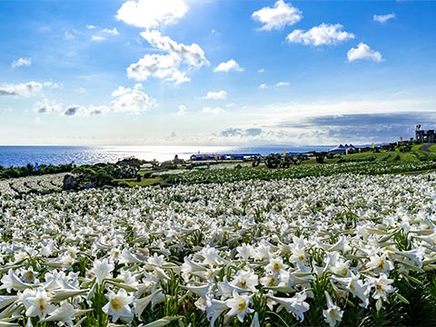毎年4月下旬からゴールデンウィークにかけて、日本一早いゆり祭りが島の北海岸にあるリリーフィールド公園で開催されます。100万輪の純白のテッポウユリをはじめ、世界のゆり約100品種が広大な公園に咲き誇り、海や空の青とのコントラストも美しく、甘い香りに包まれます。