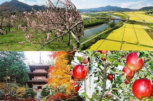 町の南西部には標高615mの名久井岳がそびえ、山と川、そして流域には田園風景が広がる豊かな自然に恵まれています。丘陵地帯では果樹栽培が盛んで、多種多様な果物が年間を通して収穫される県内有数のフルーツの産地です。