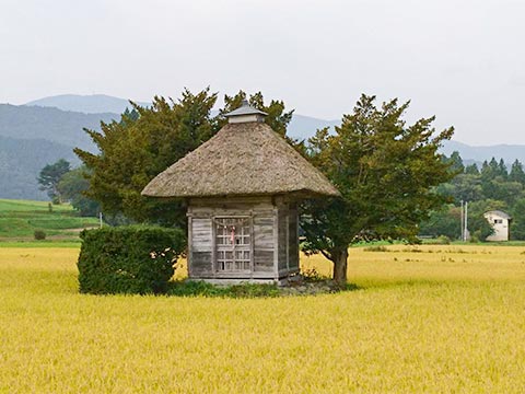 田んぼの中にぽつんと建っている荒神神社。今や遠野の代表する観光名所となっています。田植えが始まる頃、田んぼに水が入った時にしかみれない逆さに映る荒神神社。稲刈り前、荒神神社の周りを黄金色に輝く稲穂が広がっている風景が有名です。