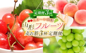 ✨/ 📢 山形市よりお礼の品のお知らせです ✨\ 『んま~い』とは、山形弁で『おいしい』という意味です! 山形の『んま~い』を是非お召し上がりください 🍒【定期便3回】☆んま~い山形☆山形フルーツ売れ筋3種定期便 (さくらんぼ佐藤錦/白桃/シャインマスカット) FY25-474🍒 果樹王国・山形市から、四季の恵みをお届けする旬のフルーツ定期便です。 初夏には甘みと酸味のバランスが絶妙な「さくらんぼ」、 夏には芳醇な香りととろける果肉の白桃、 秋にはパリッとした食感と濃厚な甘さが魅力のシャインマスカットを、 全3回に分けて旬な時期にお届けします。 昼夜の寒暖差が大きく、清らかな水と肥沃な土壌に恵まれた山形市は、高品質な果実が育つ全国有数の果樹産地。生産者が丹精込めて育てた果物を、鮮度そのまま産地直送でお届けします。 是非ご賞味ください。 山形連携中枢都市圏における共通返礼品です。関係市町(山形市、寒河江市、村山市、尾花沢市、山辺町、中山町、河北町、西川町、朝日町、大江町、大石田町)で栽培されたさくらんぼ、桃、ぶどうをお届けします。 =💠=💠=💠=💠=💠=💠=💠=💠=💠=💠=💠=💠=💠= ★ご入金後、翌月もしくは翌々月以降に記載の商品から全3回お届けいたします★ ※天候や収穫状況により、配送時期が前後する場合がございます。 ※発送開始日の指定はできません。 🍒【6月~7月】さくらんぼ(佐藤錦) 約300g(約300g×1P)L (6/10~7/5) 冷蔵 🍑【8月】柔らかくなる白桃 秀品 約1.5kg(4~10玉) (8/1~8/31) 冷蔵 ※あかつき、まどか、なつっこ、夏乙女、川中島など ※8月頃収穫の白桃は、追熟すると柔らかくなる傾向があります。 品種の特性や個体差により、甘みや追熟度が異なる(果肉が硬い、柔らかい)ものが 入る場合があります。 ※品種の指定はできません。 ※玉数はお選びいただけません。 🍇【9月~10月】シャインマスカット秀品 約500g(1房) (9/15~10/15) 冷蔵 =💠=💠=💠=💠=💠=💠=💠=💠=💠=💠=💠=💠=💠= 事業者:株式会社Avenir