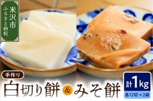 ◇◇◇どこか懐かしい農家の味◇◇◇ ◇◇◇自家栽培米「こがねもち」使用◇◇◇ 一つひとつ丁寧に仕上げた手作り白切り餅とみそ餅のセット ◆白切り餅◆ こがねもち100%使用のおもち。 噛んだ時のなめらかな食感と弾力、そしてもち米本来の甘みが口いっぱいに広がる味わい深いお餅です。 ◆みそ餅◆ 厳選した味噌と砂糖を混ぜた青畑豆入りの、ほんのり甘い冬の米沢の伝統スイーツ。 豊かな自然の中育った米沢産おもちを、ふるさとの情景を思い浮かべながら召し上がってみてはいかがですか。 《容量》 ・白切餅 1パック 500g(12切れ) ・みそ切餅 1パック 500g(12切れ)