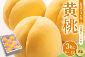〇黄色のひみつ〇 山形県にある河北町で育った黄桃。 「昼夜の寒暖差」が”美味しい黄桃”を育てる秘訣です💛 缶詰のイメージが強い黄桃ですが、生で食べると濃厚な甘さを感じられます! お好みに合わせて✨ ★かための桃が好みの方は・・・ 日を置かずにできるだけ早く食べることで、シャキシャキと新鮮な食感を楽しめます。 ★やわらかめの桃が好みの方は・・・ 食べる分だけ常温に置くとやわらかくなります。手のひらに乗せてみて、少し弾力が感じられるようになった頃が食べごろです。 【お届け内容】 黄桃 品種おまかせ 3kg (8~12玉前後) 【申込期日】 2026年7月下旬頃まで ※数量に達し次第受付終了 【発送時期】 2026年8月上旬~9月下旬 ※配送時期は天候及び生育状況により前後いたします。 ちょっと変わった黄色い桃🍑あなたもフレッシュな味をお楽しみください♪