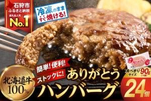 年末年始限定★ 通常寄附金額より1000円引きです★この機会にチェックしてみてください! ▌│█║ 北海道・石狩市から届く ║█│▌ 【ありがとうハンバーグとは】 「ハンバーグを解凍してから焼くのが面倒くさい」 「冷凍庫でかさばる」 「湯煎やレンチンのみだと香ばしさが足りない」 こういったお悩みがありませんか? この「ありがとうハンバーグ」は、これらのお悩みに応えるだけでなく、抜群の美味しさを提供する大人気ハンバーグです! 【冷凍のまま焼ける】 こちらの「ありがとうハンバーグ」には無数の穴をあけており、この特殊設計が調理を格段に便利にします。 冷凍のままでも短時間ですぐに焼け、短時間であることで「旨味」が逃げないメリットもあります。 【冷凍庫にやさしい】 「ありがとうハンバーグ」は、個包装になっているため使いやすさが抜群です。 またここでも「穴」に秘密があり、焼けばふっくらとするのに冷凍時には約1cm程度の厚さなので冷凍庫の貴重なスペースにも優しいです。 【味】 北海道産牛肉が100%使用され、肉本来の旨味を感じるシンプルな味付けになっています。 そのままでもしっかり美味しく、口コミなどでも「牛肉の味がしっかり」とのお言葉を多くいただきます。 これは北海道産牛肉の特徴が、「脂身ではなく赤身のおいしさ」であるからです。 そのままでも美味しいですが、様々なアレンジにもお使いいただけると思います。 ※アレンジ用のレシピも同梱していますので是非ご活用ください。 【サイズ】 ハンバーグ1個のサイズが90gとなっており、スーパー等では見かけても、お取り寄せ等では見かけないサイズかもしれません。 皆様の日々の状況に合わせてお気軽にお召し上がれるよう「大は小を兼ねる」ではなく「小は大を兼ねる」というサイズでつくっています。 【安心】 「北海道HACCP」の認証を得た工場で製造しています。 お肉をひいてから3時間以内に形成し急速冷凍をしており、さらには最初から最後まで人の手で触れないようにし低温を保つため衛生的です。 お子様のお弁当にも安心してお使いいただけます。 「ホクビー」は製造商品のほとんどが業務用のためあまり知られていない会社かもしれません。 実は全国のホテルやレストランから好評いただいており、日本の食の裏方として皆様の食を支え続けてきた会社です。 これから先も北海道石狩市より皆様の食を支えます。