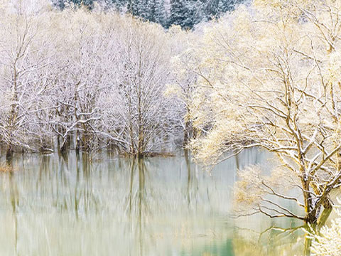 飯豊町は町の面積の約8割が森林に囲まれた自然豊かな町です。山々が一斉に芽吹く春、強い日差しの中に稲風が一時の涼やかさを運ぶ夏、田園が黄金色に輝く秋、山々の峰が徐々に白く塗られる冬。この多彩な四季の変化が、祭や伝統工芸、食の豊かさにつながっています。幻想的な白川湖の水没林も見どころです。