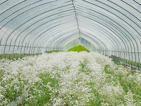 カスミソウは村の基幹産業で、夏秋期出荷量が日本一の全国トップシェアの産地であります。「満点の星」を思わせる無数のカスミソウの花は、昭和村の風物詩です。特別豪雪地帯という環境から、冬に積もった雪を利用し、カスミソウを出荷までの間、予冷をする等品質管理においても独自の工夫をしています。