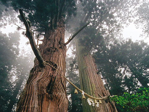 樹齢1,200年を誇る大きな杉。仲睦まじい夫婦のように寄り添って、天高くそびえ立つ巨樹は、類例があまりありません。(国指定天然記念物)このような巨大な木が二本ならんで真っすぐにそびえ立ち、ほぼ同じように成長しているのは大変めずらしいといわれています。