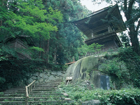 標高668mの「東堂山」は小野町のシンボルの一つで、中腹には満福寺があります。古くから家畜繁盛・守護のご利益があるとして広く信仰を集めてきました。史跡名勝天然記念物に指定されている杉並木の表参道を抜けると、巨大な自然石の上に建つ近世木造建築の粋を集めた東堂山鐘楼にたどり着きます。