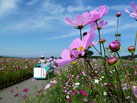 鬼怒グリーンパークは、鬼怒川の河川敷にある「水とのふれあい」をテーマとした広大な公園で、敷地には、四季の花々が植えられており、10月頃に赤・ピンクや白、黄色い花が咲き乱れるコスモス畑は、町外からも大勢の人々が訪れます。水上アスレチック、貸し自転車、貸しボートなどのアクティビティもたくさんあります。