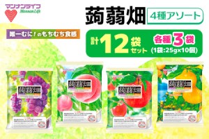 《唯一むに!のもちむち食感》 こんにゃく(グルコマンナン)を果汁で味付けした、フルーツこんにゃくです。 果物では味わえないこんにゃく独特の食感は、さらに美味しさを引き立てます。 《4種類の味の食べ比べアソート》 ぶどう味:もぎたてのぶどうのみずみずしい甘さをイメージ 白桃味:香り高くジューシーな白桃を、丸ごとかじった時の広がる果実感をイメージ りんご味:特長であるシャキシャキした食感と、後味のフレッシュな酸味をイメージ 温州みかん味:温州みかんの優しい甘さとジューシーな酸味を表現 《こんなとき、蒟蒻畑》 ★仕事の合間にリフレッシュ! ★プラス1品!ヘルシーデザート ★「ちょっと食欲がないかも」なときも食べやすい! 《ハートの容器の理由》 マンナンライフのハートの容器は、ゼリーを出しやすく、食べやすくするために改良を重ねて開発されました。 容器の底をつまんで押し出すと、ゼリーが出てきます。 吸い込まずによく噛んで召し上がっていただくと、こだわりの食感を存分にお楽しみいただけます。 《こんにゃくゼリーのパイオニア》 「蒟蒻畑」は、いまや日本全国で知らない人がいないと言っても過言ではないほど、親しまれるブランドへ成長することができました。 そんな「蒟蒻畑」が群馬県で誕生した商品と知って驚く人もいるようです。 マンナンライフは地元名産のこんにゃくと弊社独自技術をコラボレーションさせた、こんにゃくゼリーのパイオニア。 群馬県産のこんにゃく粉を使用し、群馬県で蒟蒻畑を生産しております。 私たちは、「蒟蒻畑は群馬発の全国ブランド」だと自負しております。 【注意事項】 ※お子様や高齢者の方は、のどに詰まるおそれがありますので、食べないでください。 ■提供事業者:有限会社マルヤマ鈴木商店 【地場産品基準】 (3) 当該地方団体の区域内において返礼品等の製造、加工その他の工程のうち主要な部分を行うことにより相応の付加価値が生じているものであること。