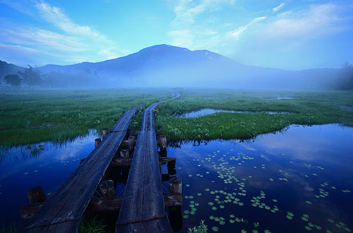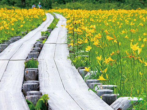 南北2㎞、東西6㎞にもおよぶ本州最大級の高層湿原。至仏山と燧ケ岳の2つの山に囲まれた広大な湿原では、名曲「夏の思い出」に歌われたミズバショウ、鮮やかな黄色い花で人気のニッコウキスゲといった美しい高山植物が楽しめます。