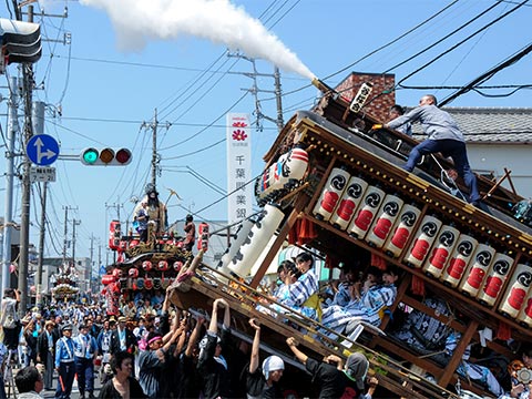 江戸時代、水利問題や干ばつが解決に向かったことを神に感謝し始まったと伝えられる日吉神社の祭礼。東金鎮守日吉神社の神さまが神輿へ遷り、9区の山車・屋形の先導で各地のお宮を回るこの祭典は、祭歴300年を超える東金を代表する伝統行事です。