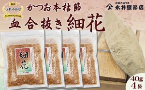 創業大正9年の老舗「永井鰹節店」より『かつお本枯れ節 血合抜き細花』40g×4袋をお届けします。 某有名デパート限定で販売していた永井鰹節店の『血合抜き細花』は、生産量が少ないため現在は工場直売所限定にて販売しています。 卸先の事業者様から「是非ウチで販売したい!」との声も多いなか、この度特別にふるさと納税にご提供頂きました! カビ付けを繰り返し完成した「本枯れ節」は鰹の脂分が分解され、イノシン酸などの旨味成分が多くなり、すっきりとした上品な鰹の旨味を味わえるため料亭などで利用されています。 さらに、血合いを抜くことで鰹の生臭みが抑えられ、薄い綺麗なピンク色の花のような削り節が出来上がります。 雑味の無い上品な味わいと鰹節本来の香り。鴨川のぷれみあむな逸品をお楽しみください!